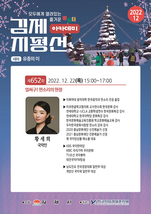 김제시에 따르면 종강식과 함께 2022년의 마지막 강연인 제652회 지평선아카데미에 황세희 국악인을 초청해 ‘얼씨구! 판소리의 현장’이라는 제목으로 진행한다.