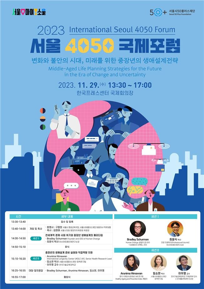 [세계로컬타임즈 이효진 기자] 서울시50플러스재단은 변화하는 미래 사회에 대응하는 중장년의 생애설계전략을 모색하고자 오는 29일 한국프레스센터에서 국내외 전문가들이 한자리에 모이는 ‘서울 4050 국제포럼’을 개최한다.