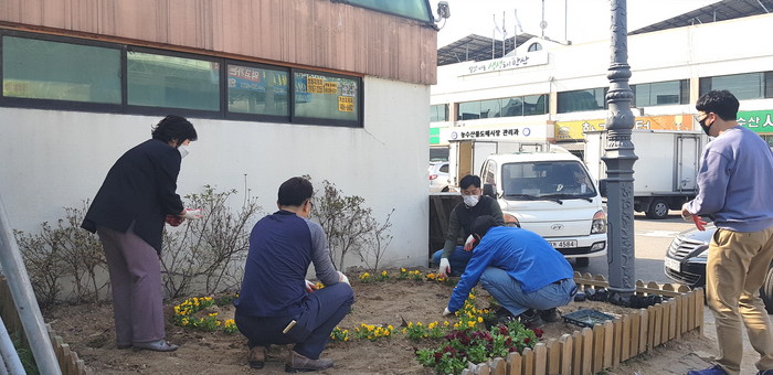 농수산물도매시장관리과 직원 등 10여명은 전날 농수산물도매시장에 꽃 상자 30여개와 공터에 팬지·올리비아 등 봄꽃 1,000여 본을 식재했다.