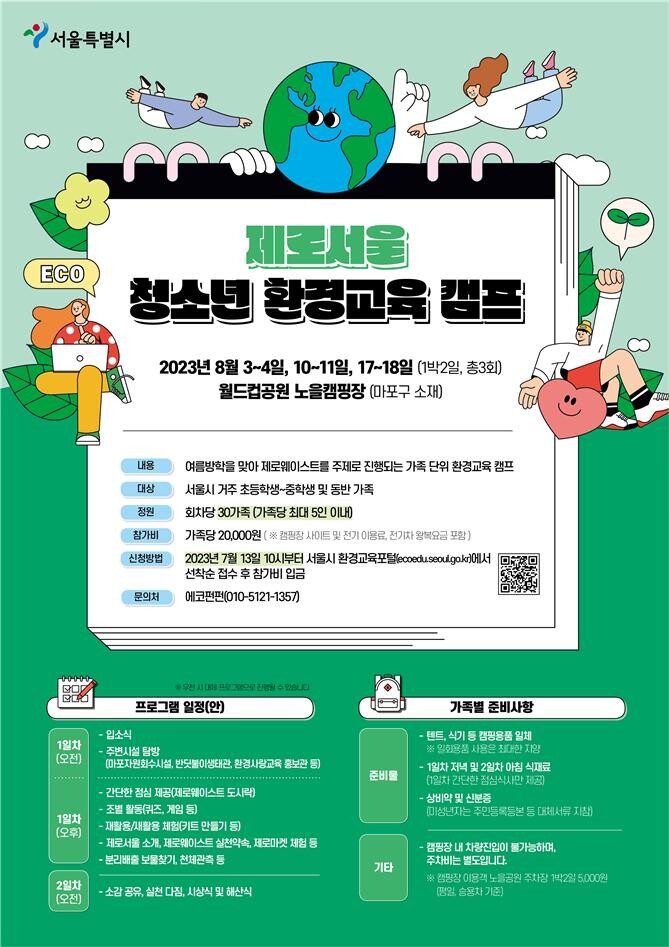 [세계로컬타임즈 이효진 기자] 서울시는 여름방학을 맞아 8월 아동·청소년들이 가족과 함께 캠핑을 즐기면서 쓰레기 줄이기와 환경보호를 체험하는 ‘제로서울 청소년 환경교육 캠프’를 운영한다.