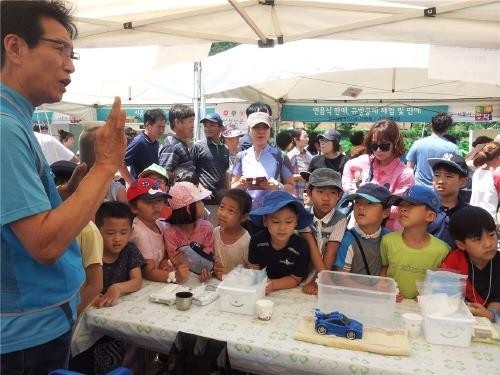 | ▲ 연꽃 농부장터 관계자가 방문한 시민들에게 연에 대해 설명하고 있다. <사진제공=시흥시청> |