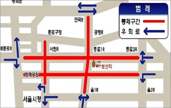 31일 21시부터 익일 1시30분까지 보신각 일대 차도를 전면 통제하고, 23시부터 익일 1시 사이에는 1호선 종각역을 무정차 통과하고 종각역 출입구가 전면 폐쇄된다.