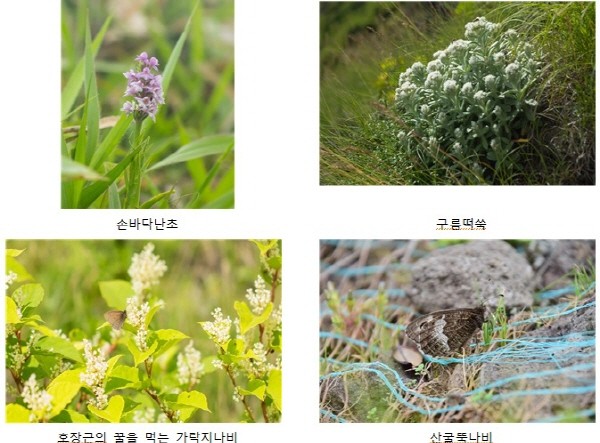 | ▲ 한라산 윗세오름 일대에서 보호되고 있는 산굴뚝나비와 야생화 모습.<사진제공=한라산국립공원> |
