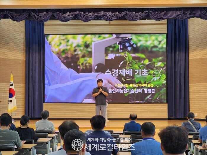 강형곤 농업기술센터 원예기술팀장이 강사로 나서 하우스시설 화훼 수질 및 양액(식물 생장에 필요한 양분 수용액)관리 교육을 했다.