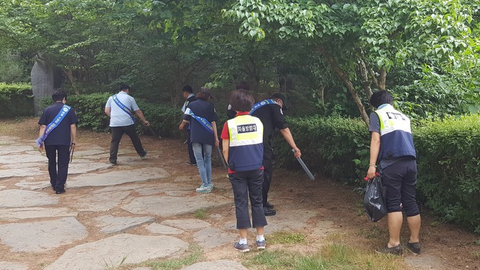 | ▲ 세종시 자율방범대 대원들과 세종시청 생활안전과 직원들이 12일 조치원읍 오봉산 주변에서 쓰레기를 수거하고 있다. <사진제공=세종시청> |