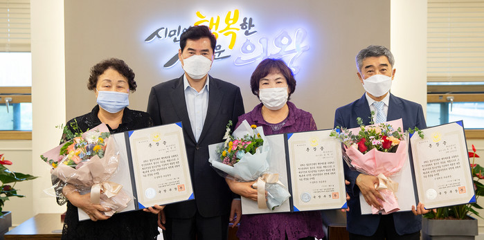 | ▲ 김상돈 의왕시장이 6·25 참전자 자녀와 무공훈장 전수식을 가진 후 기념촬영을 하고 있다. (사진=의왕시 제공) |