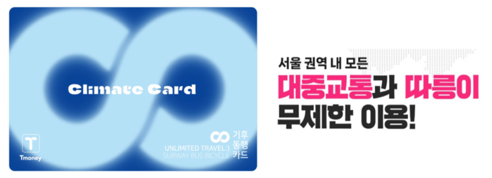 서울시의 기후동행카드는 기후변화 대응·대중교통 무제한 이용·민생 편의까지 일석 삼조 효과를 갖는 신개념 대중교통 통합정기권으로, 카드 한 장으로 대중교통 뿐만 아니라 공공자전거 따릉이까지 횟수 제한 없이 이용할 수 있다.