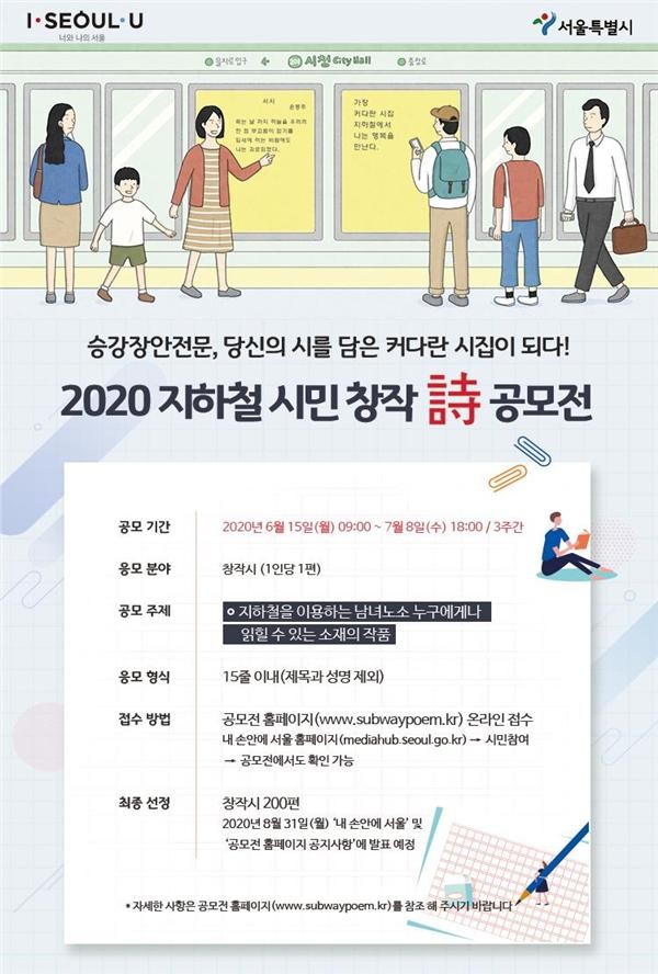 15일부터 7월 8일까지 시민 누구나 1인당 1편 온라인으로 응모할 수 있으며, 심사를 통해 선정된 200편의 시는 지하철 1~9호선, 분당선 총 314개역 승강장 안전문에 게시될 예정이다.