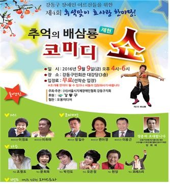 추석을 맞아 장애 어르신을 위한 '제4회 추석맞이 효사랑 한마당 - 추억의 코미디쇼' 공연이 9일 강동구민회관 3층 대강당에서 오후 4시에 열린다.