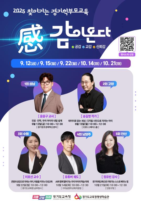‘찾아가는 경기학부모교육 시리즈’는 ‘감(感)이 온다’를 주제로 ▲진로·진학, 우리 아이의 내일 설계 ▲데이터로 읽는 세상, 디지털 시민으로 자라는 아이 ▲존중과 공감으로 자라는 아이, 마음을 키우는 인성교육 ▲인공지능(AI)과 함께 열어가는 우리 아이의 학습 미래 ▲경기미래교육으로 키워가는 스스로 배우는 힘 등 ‘공감·교감·신뢰감’을 느낄 수 있는 다양한 생각을 나눌 예정이다.