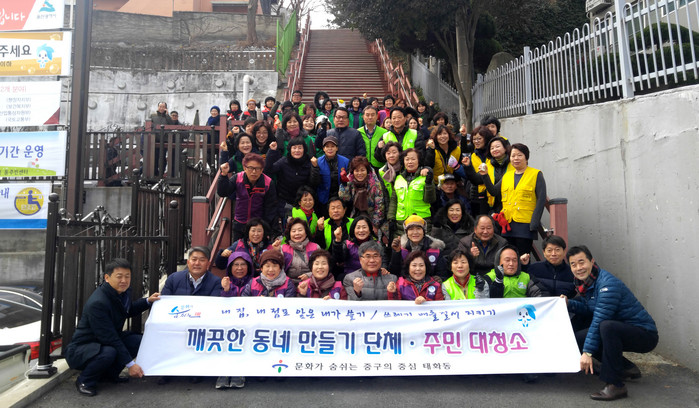 | ▲ 울산시 중구 태화동 주민센터가 지난 20일 오전 10시 평동길, 화진길 일원에서 설맞이 일제 대청소를 실시한 후 참가자들이 단체로 기념촬영하고 있다. 이날 행사에는 통정회 등 자생단체원과 장애인일자리 참여자, 지역주민 등 100여명이 참가했다.<사진제공=울산 중구청> |