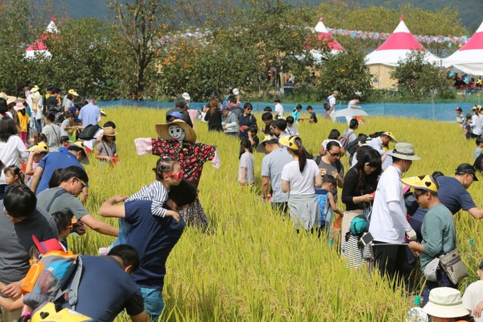| ▲ 제6회 완주와일드푸드축제에 참가한 시민들이 친환경 논에서 체험을 하고 있다.<사진제공=완주군청> |
