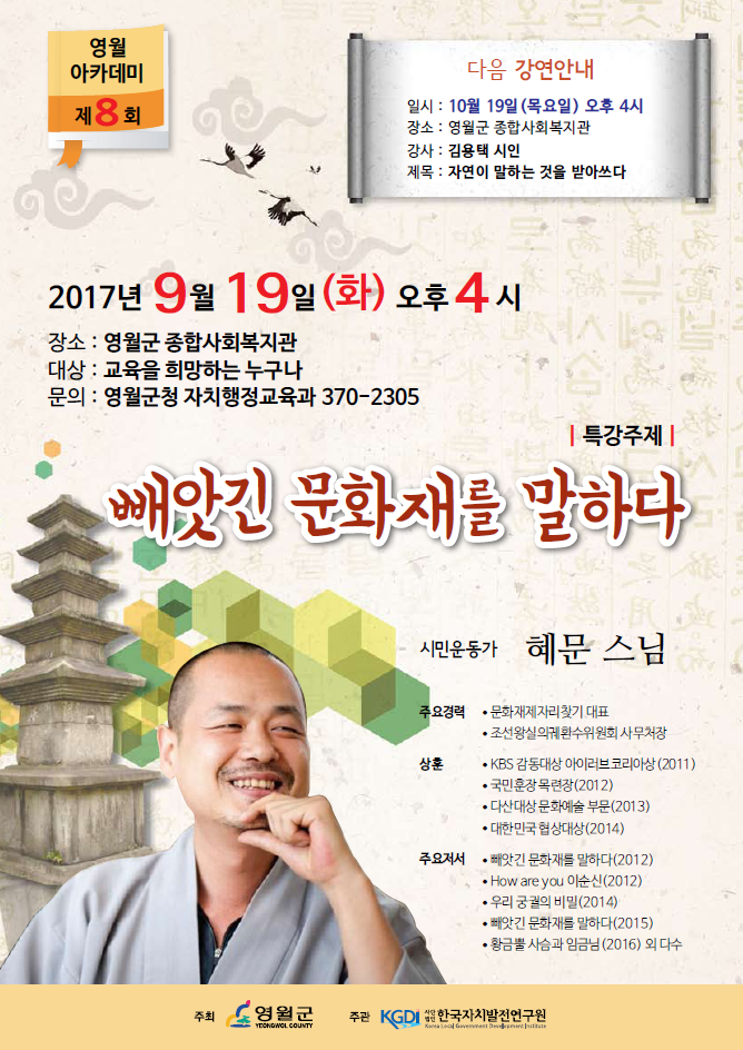 | ▲ 혜문스님을 초청해 오는 19일 개최하는 영월아카데미 특강 포스터.<사진제공=영월군청> |