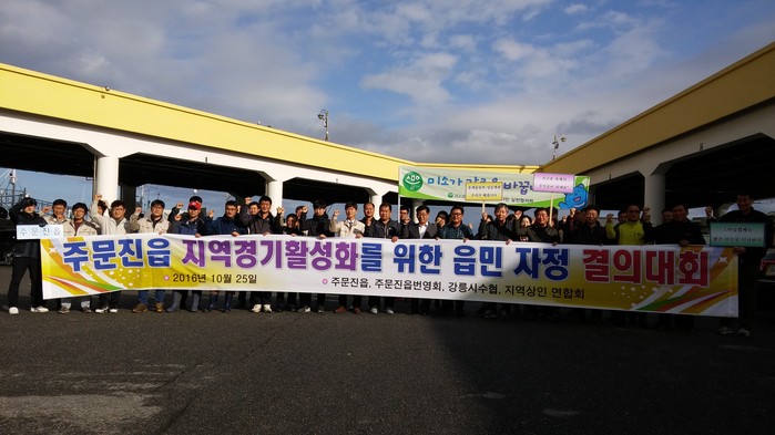 | ▲ 25일 강원도 강릉시 주문진항 물량장에서 주문진읍번영회와 상인연합회 회원 등이 지역경기활성화를 위한 읍민 자정 결의대회를 열고 있다.<사진제공=강릉시청> |