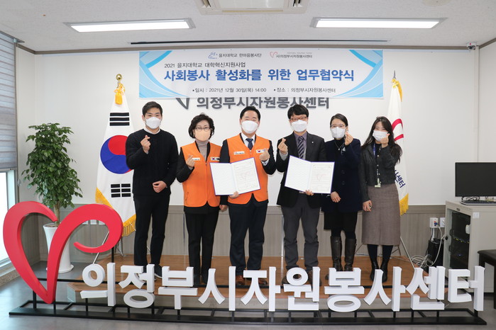 [세계로컬타임즈 한기선 기자] 의정부시자원봉사센터(이사장 이용걸)와 을지대학교 한마음봉사단(단장 한동균)은 지난해 12월 30일 관내 사회봉사활동 활성화 및 의정부 관내 자원봉사활동의 발전을 위한 업무협약식을 진행했다.