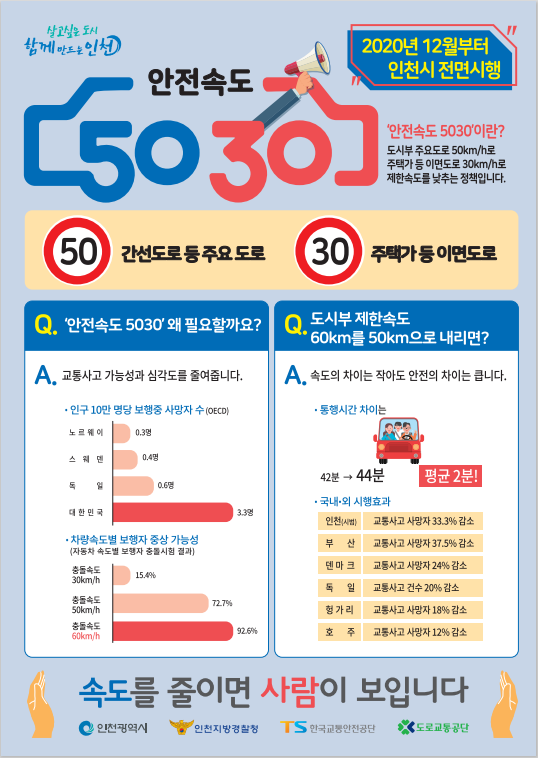 ‘안전속도 5030’은 최근 지속적으로 발생하는 보행자 사망사고를 예방하기 위해 도시지역 차량 속도를 하향 조정하는 정책으로, 간선도로 등 주요 도로는 시속 60km에서 50km로, 주택가 등 이면도로는 50km에서 30km 이하로 각각 하향 조정된다.