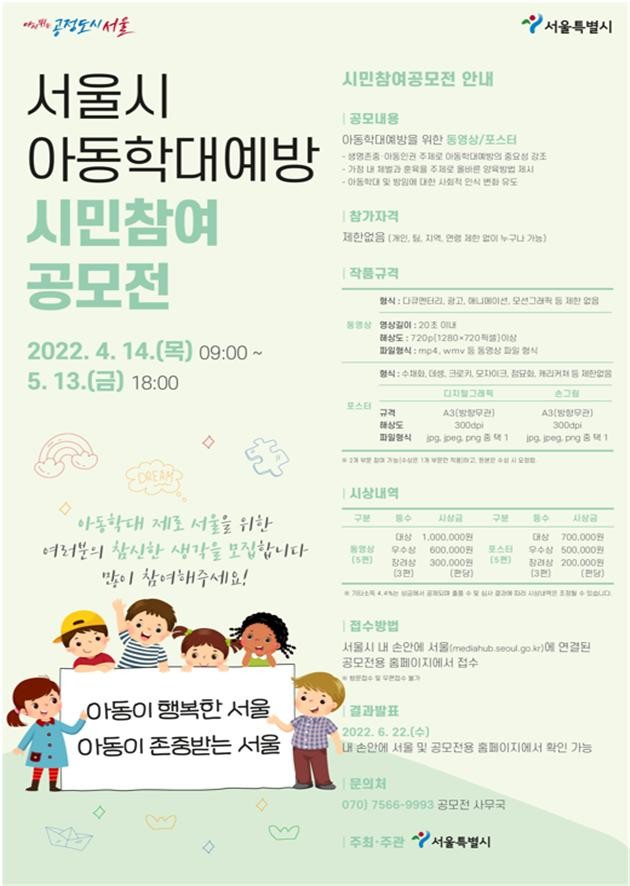[세계로컬타임즈 이효진 기자] 서울시는 5월 가정의 달을 맞아 아동학대를 근절해야 하는 사회적 인식을 확산하기 위해 ‘아동학대 예방 홍보콘텐츠(동영상·포스터) 공모전’을 개최한다.