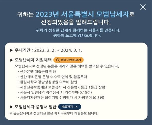 서울시는 올해부터 모범납세자 선정 결과 및 지원 혜택을 보다 쉽게 확인하고 혜택을 누릴 수 있도록 알림창 자동 표출 등 안내 방법을 개선하고 서울시 블로그 등 온라인 매체를 통해서도 홍보를 진행한다.