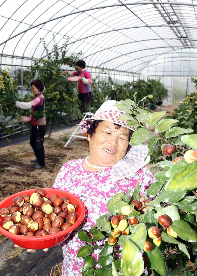 [세계로컬신문 강완수 기자] 전남 함평군 학교면 석정리의 대추나무 비닐하우스에서 주민들이 잘 익은 대추를 수확하고 있다. 28일 함평군에 따르면 군은 '1시군 1특화작목'으로 대추를 집중 육성하고 있으며 올해 94농가가 17ha 규모로 대추를 재배하고 있다. 수확기간은 다음달 15일까지 한 달간이며 다음달 열리는 대추 팜파티와 대한민국 국향대전에서 판매될 예정이다.<사진제공=함평군청>