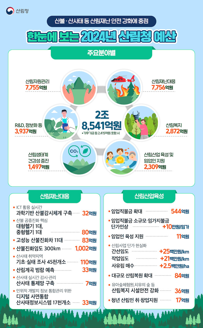 분야별로는 산림재난 대응 7,756억 원, 산림자원 관리 7,755억 원, 산림산업 육성과 임업인 지원 2,309억 원, 산림복지 2,872억 원 등이 편성됐다.