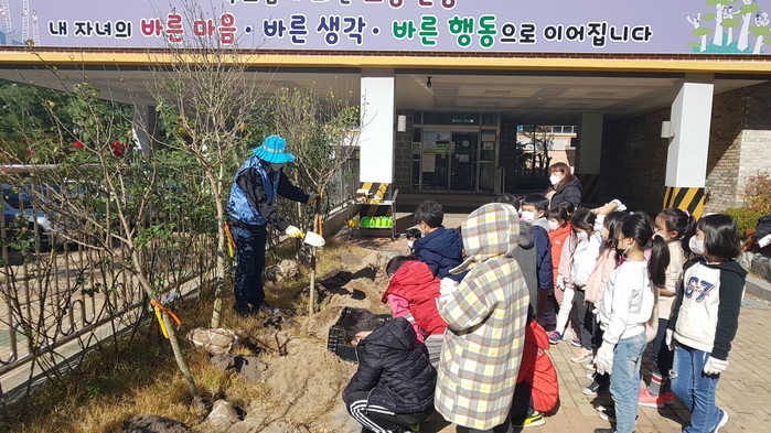 | ▲ '무궁화를 사랑하는 사람들' 시민단체에서 다솔초 학생들에게 무궁화 바로알기 교육을 하고 있다. (사진=수원시 제공) |