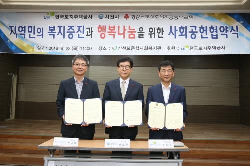 ▲ 23일 삼천포종합사회복지관에서 송도근 사천시장(가운데)과 신동철 LH 주거복지본부장(오 른쪽), 경남사회복지공동모금회 김용희 사무처장(왼쪽)이 '사회공헌 협약식'을 진행하며 기념 촬영하고 있다. <사진제공=사천시청> |