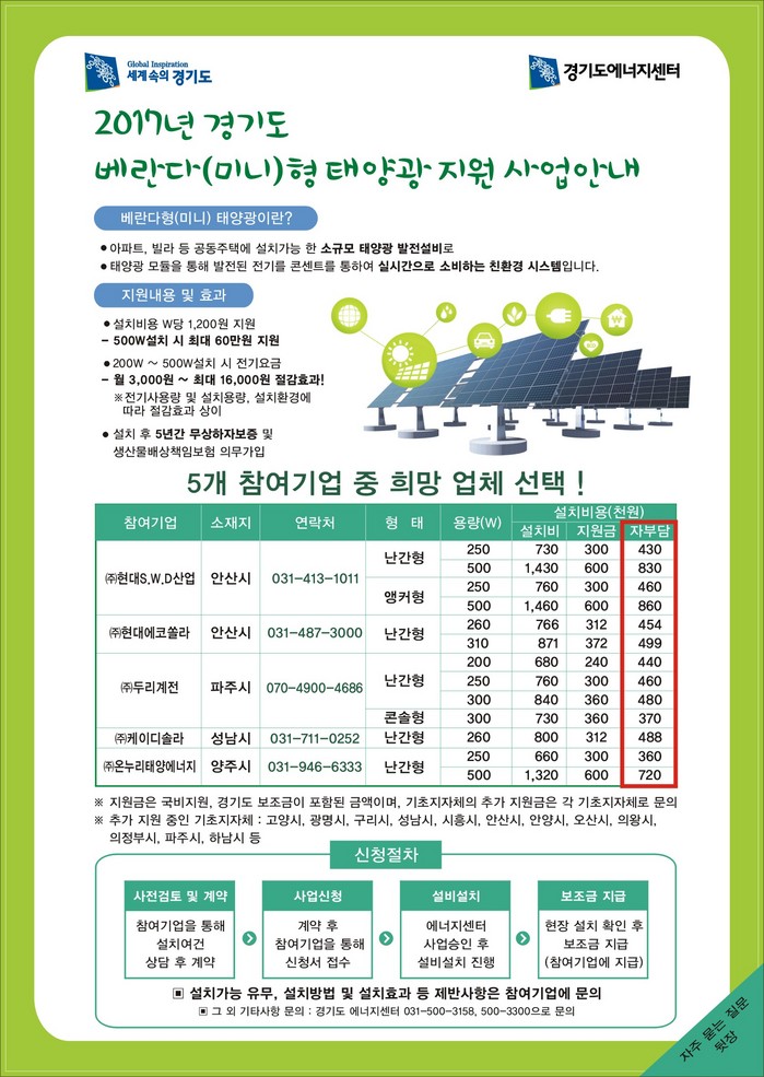 베란다형 태양광 발전설비는 공동주택의 각 가정에 설치 가능한 소규모 시설이다.