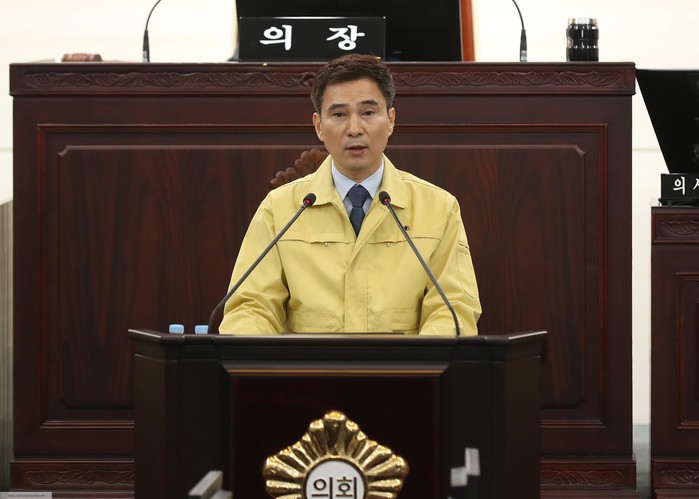 | ▲ 서철모 화성시장이 시의회 임시회에서 재난생계수당에 대한 제안 설명을 하고 있다. (사진=화성시 제공) |