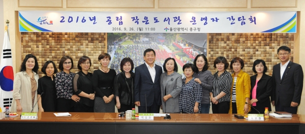 ▲ 박성민 울산시 중구청장(왼쪽에서 7번째)이 26일 오전 구청 회의실에서 2016 도서관 운영 활성화를 위한 간담 회를 개최한 후 공립 작은도서관 대표 등 참석자들과 함께 기념촬영하고 있다.<사진제공=울산 중구청> |