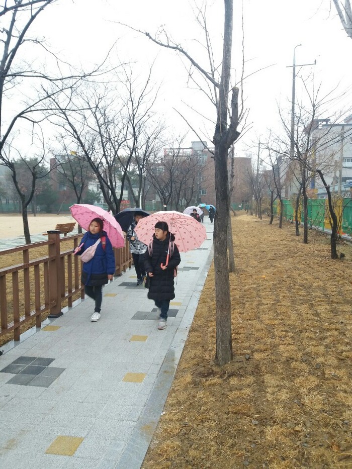 | ▲대구 서구 인지초등학교 학생들이 보행로 확보로 안전한 등교를 하고있다.(사진=대구 서구 제공) |