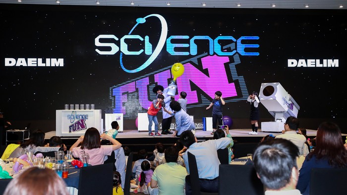 | ▲ 대림 직원 가족 초청행사에 참여한 임직원 가족들이 사이언스쇼 공연단과 함께 과학실험에 참여하고 있다. (사진=대림산업) |