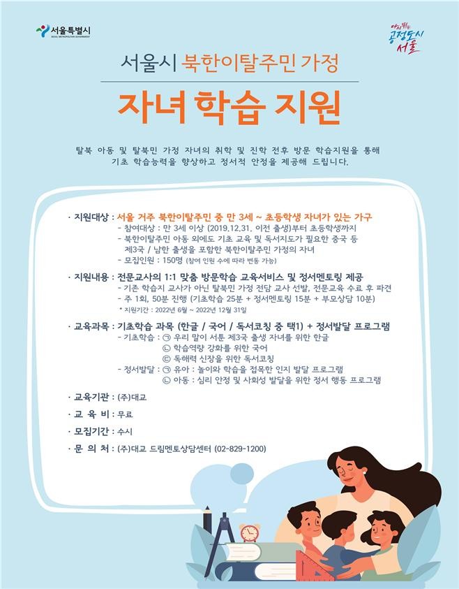 [세계로컬타임즈 이효진 기자] 서울시는 학습결손, 문화차이, 심리적 불안 등 어려움을 겪는 탈북민 가정의 교육격차 해소를 위해 ‘가정 자녀 학습 지원 사업’을 시작한다.