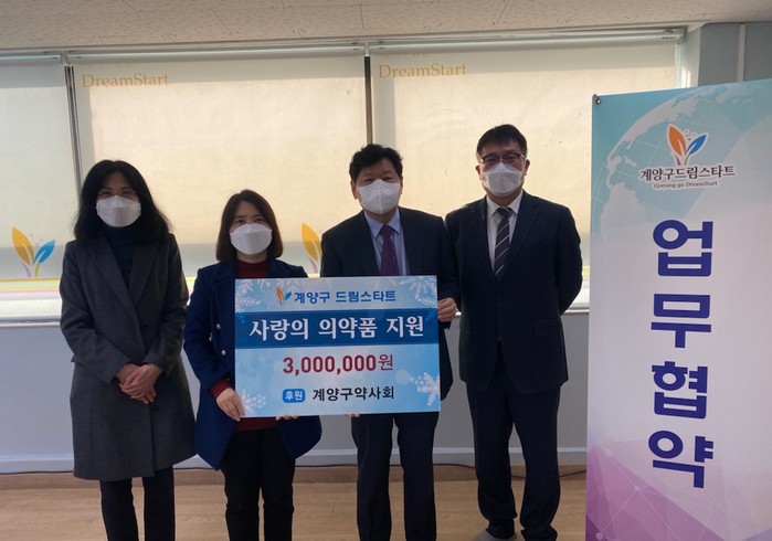 | ▲ 계양구드림스타트, 계양구약사회와 ‘사랑의 약품지원’ 업무협약 체결 후 기념촬영하고 있다. (사진=계양구 제공) |