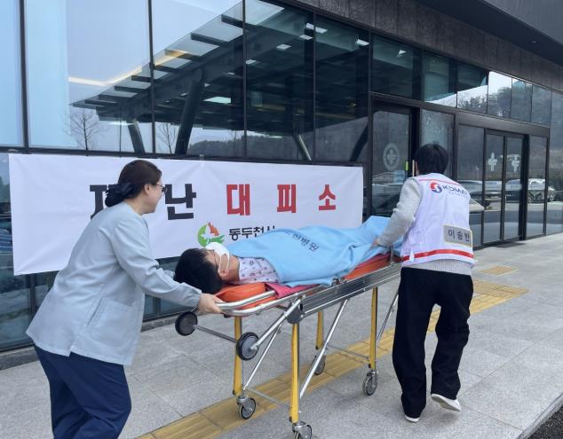 이번 훈련은 병원 위쪽 산에서 산불이 발생한 상황을 가정해 진행됐다. 산불 상황 전파를 위해 ‘산불 발생 알림’, ‘사전 대피 실시’, ‘즉시 대피 실시’ 등 총 세 차례의 안내·재난 문자를 발송하며 대피 훈련을 실시했다.