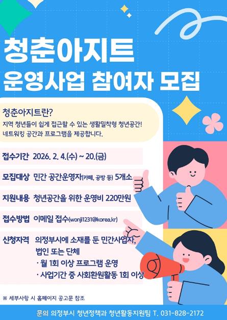 신청 대상은 의정부시에 소재를 둔 등록사업자로, 청년(19~39세)을 대상으로 월 1회 이상 프로그램을 운영하고, 전시‧행사 참여 등 사회환원 활동을 1회 이상 수행해야 한다.