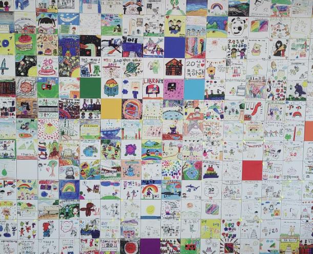 어깨동무담은 전국 기적의도서관 어린이 200명의 축하메시지 타일 그림으로 대형 벽화를 구성했으며 이를 통해 전국 어린이들이 연대하는 모습이 돋보이는 공공디자인을 선보였다.
