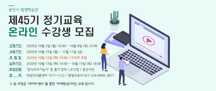 | ▲ '제45기 정기교육 온라인 수강생 모집' 안내 포스터. (사진=용인시 제공) |