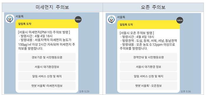 또한, 카카오 알림톡인 ‘서울톡’ 은 기존 대기정보 알림 문자(단문·장문)보다 약 20~60% 정도 저렴한 비용으로 서비스를 제공해 예산 절감 효과가 있으며 절감된 예산만큼 더 많은 시민들에게 양질의 대기정보 알림서비스를 확대 제공할 것으로 기대하고 있다.