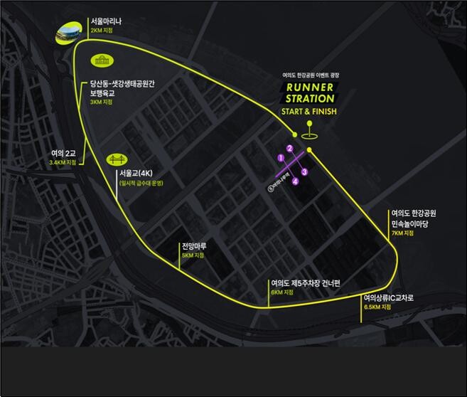 코스는 여의나루역 이벤트광장을 출발해 여의롤장~서울마리나~샛강생태공원 보행육교~여의2교~서울교~전망마루~여의도 제5주차장 건너편~여의상류 IC 교차로~여의도 한강공원 민속놀이마당~여의나루역 이벤트광장으로 돌아오는 8.4km 구간이다.