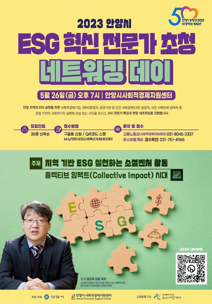 [세계로컬타임즈 이복한 기자] 안양시는 오는 26일 오후 7시 평촌동 안양시사회적경제지원센터에서 ESG(환경·사회·지배구조) 혁신 전문가를 초청해 네트워킹 데이를 연다.