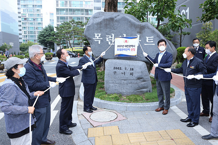 [세계로컬타임즈 민순혜 기자] 허태정 대전시장은 지난 15일 2021년 공동주택 모범관리단지로 선정된 서구 목련아파트와 유성구 대덕테크노밸리 5단지를 방문해 인증 동판 제막식을 가졌다.
