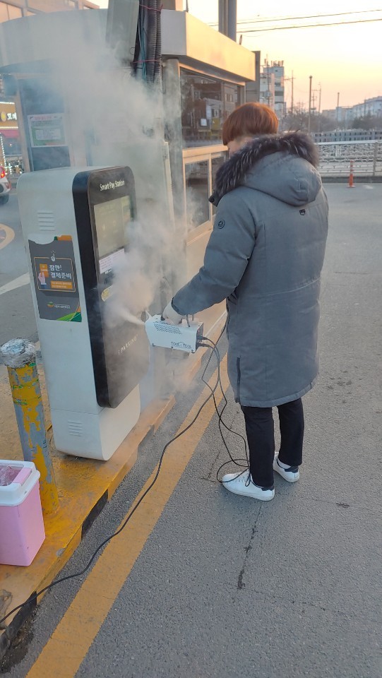 주차장 건물 내부와 승강기뿐만 아니라 주차부스·주차 정산기 등에 대해 방역 전용 장비, 분무기형 소독기 등을 이용해 일일이 소독을 진행했다.