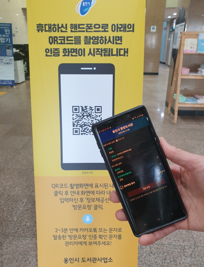 | ▲ 용인시 공공도서관에 QR코드를 활용해 출입하는 모습. (사진=용인시 제공) |