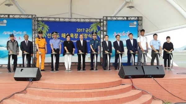 | ▲ 지난 6일 선유도 해수욕장 특설무대에서 주요 인사들이 해수욕장 개장 버튼을 누르고 있다.<사진제공=군산시청> |