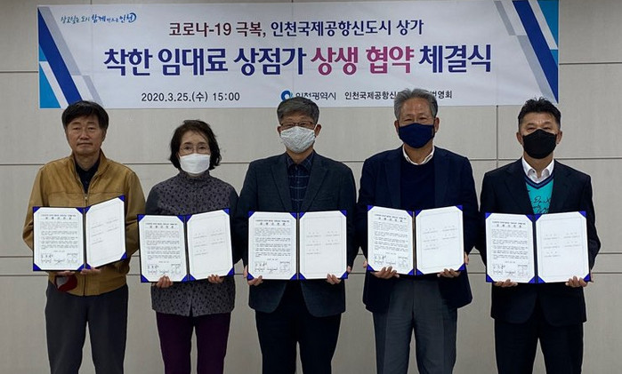 인천시는 최근 중구 운서동주민센터에서 인천국제공항신도시 상가번영회장, 건물주 대표 등이 함께 뜻을 모아 코로나19 위기 극복과 지역상권 활성화를 위한 착한 임대료 상생협약식을 가졌다.