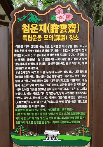 ‘첨운재’는 대구 상인동 출신의 독립운동가 향산(香山) 윤상태(尹相泰 1882~1942)의 별서(別墅)로 동지들과 독립운동을 모의한 역사적인 장소다.