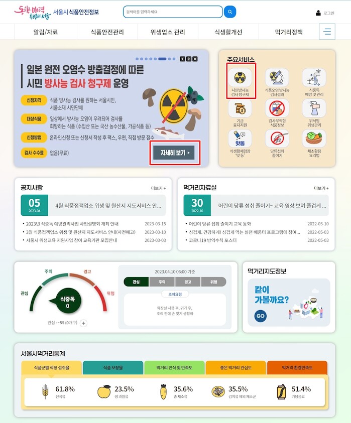 아울러 올해 처음 모집한 ‘서울시 시민안전밥상지킴이’와 함께 전통시장, 소규모 식품판매점, 대형마트 등을 중심으로 휴대용 방사능 계측기를 이용한 ‘간이측정검사’를 실시해 방사능 안전관리를 더욱 강화할 계획이다.