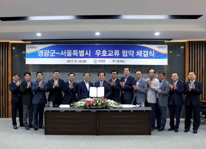 [세계로컬신문 이남규 조사위원] 김준성 전남 영광군수와 박원순 서울시장은 지난 18일 영광군청 소회의실에서 문화·관광 활성화, 농·수·특산물 판매확대, 청년 자립 생태계 조성 등 우호교류 협약을 체결했다.