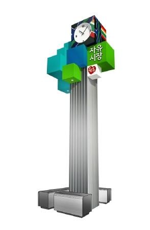시계탑 상징물은 자유를 상징하는 하늘의 자유로운 구름과 전통시장을 의미하는 우리 고유의 전통 색감인 단청 무늬를 활용해 자유시장의 푸른 미래를 꿈꾸는 시장분위기와 구름처럼 모여드는 고객들 쇼핑 후 기분 좋은 즐거움을 하늘의 구름으로 표현했다.