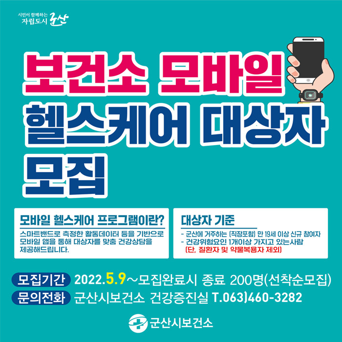 [세계로컬타임즈 조주연 기자] 전북 군산시 보건소는 오는 9일부터 스마트워치를 기반으로 하는 모바일 헬스케어 사업에 참여할 시민 200명을 선착순 모집한다.